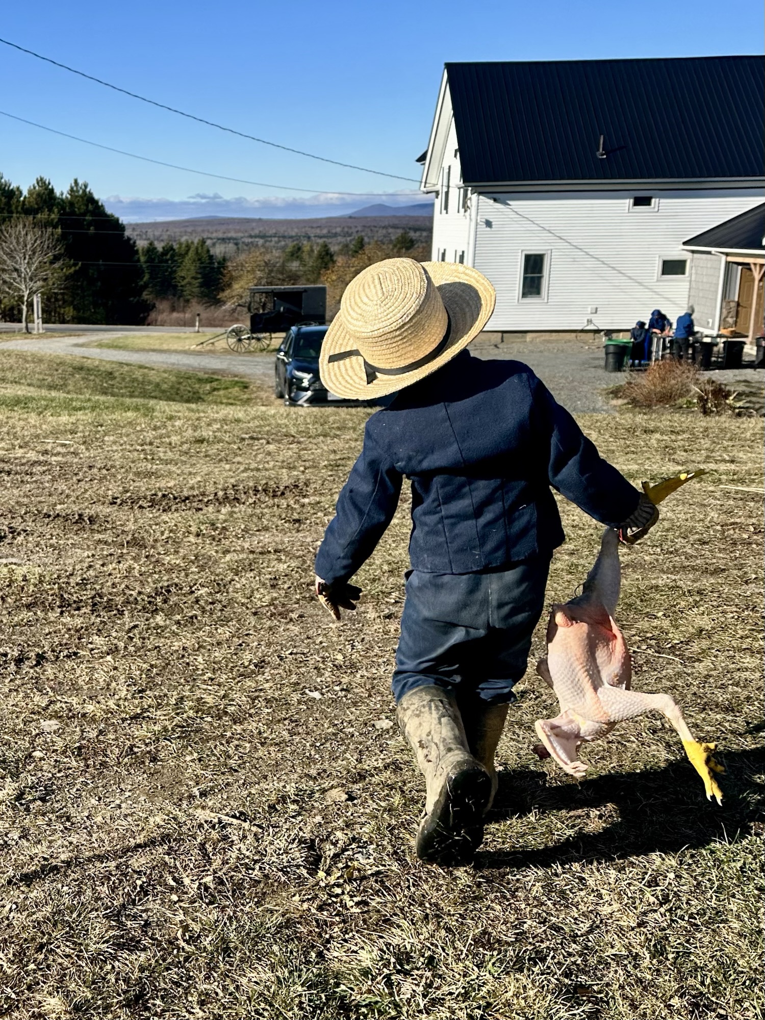 My shadow is long in the pasture as I roll portable fence rope and pull fiberglass posts from the ground, disassembling the chicken pasture as we are done with meat birds for the season. I pull turkey feet from my pockets and toss them to the farm dogs, a chewy treat and reward for keeping the livestock safe. My back is to the road as I hear the familiar clip-clop of hooves echoing from up the road. I turn and see Menno’s head leaning from his buggy, his face covered by the brim of his hate as a hand reaches out in a wave while the other holds the reigns tied to our horse. Having delivered the school teacher and children home, he and Mary are off and their errand. They won’t be back until well after dark, when they’ll swap our horse for theirs in the barn before their final 2-mile trot for home.